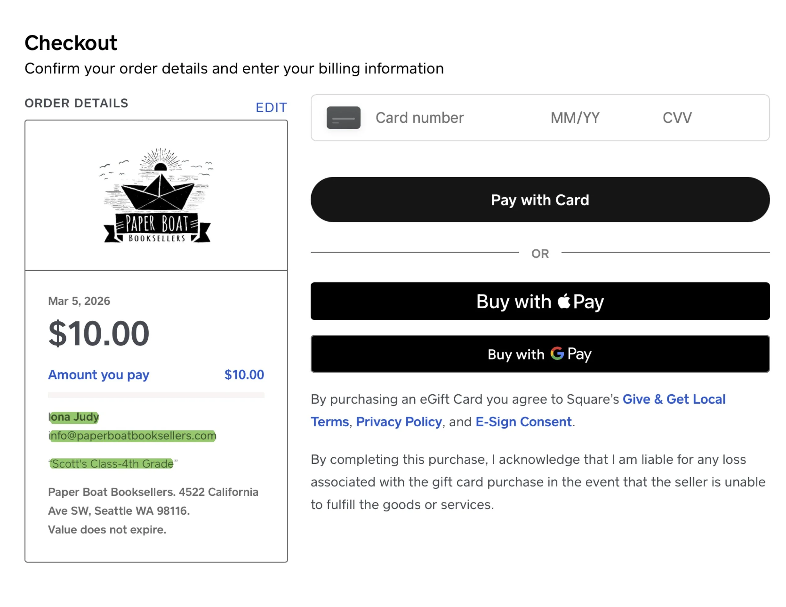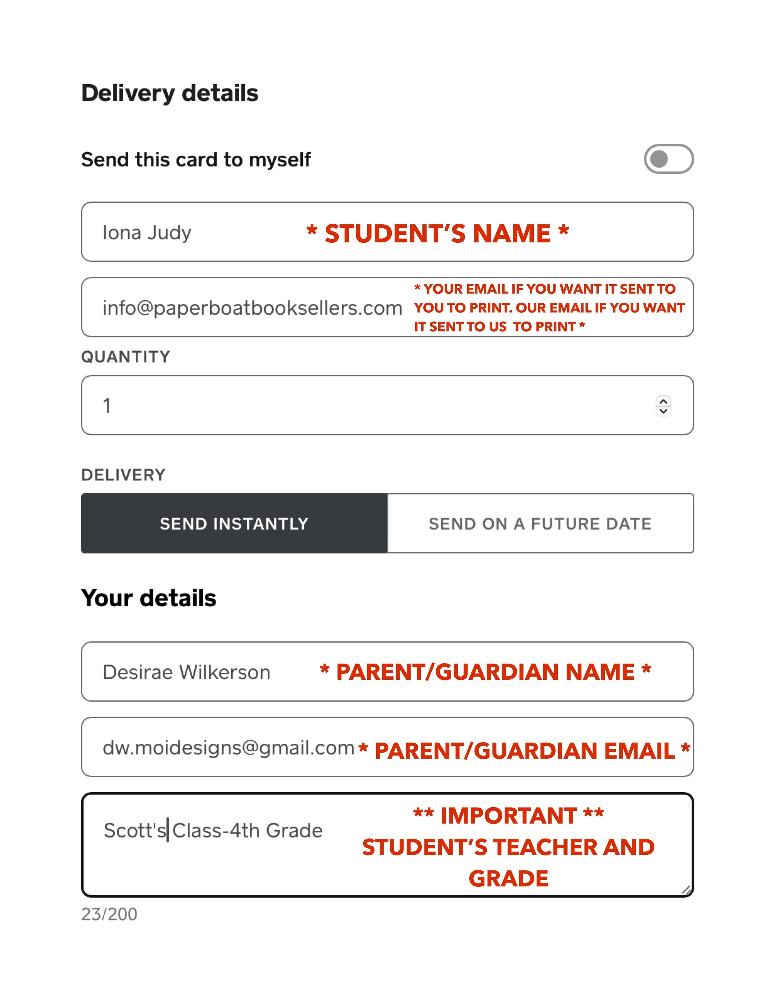If you are sending it to us, be sure to put our email address under “Delivery Details” right after your student’s name. Gift Cards can be sent to: info@paperboatbooksellers.com. You will receive a confirmation to your email (hold onto it just in case) and we will receive the digital card to our email.